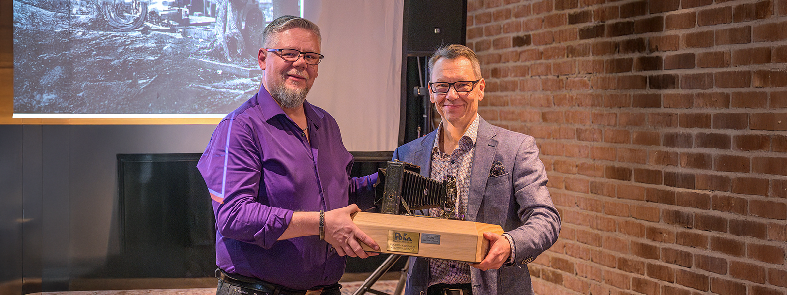 PoKa - kuukausikilpailu ja kerhon VUODEN VALOKUVAAJA. Vuoden 2025 voittaja Jukka Pinonummi on kuvassa vasemmalla ja kiertopalkinnon luovutti pj Christian Olenius.